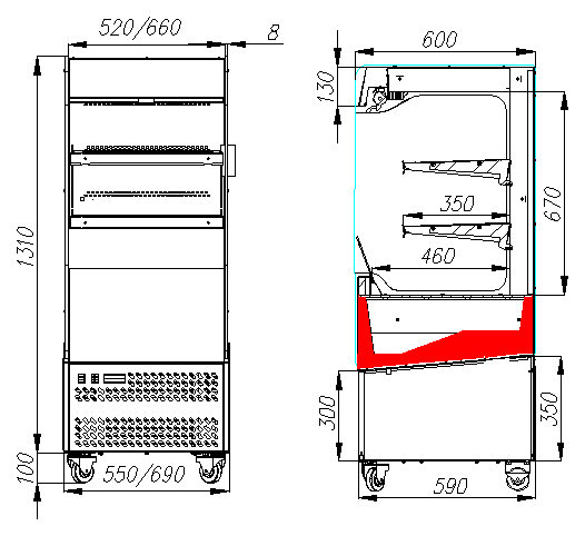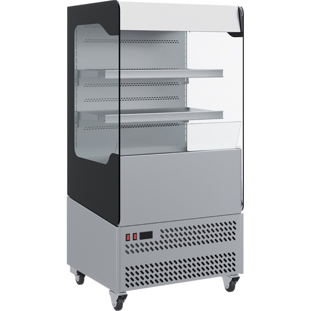 Модель оснащена двумя рядами перфорированных полок, которые пропускают свет и позволяют демонстрировать продукцию наиболее выгодно. Горка оборудована ночными шторками и четырьмя колесами для удобства перемещения. Корпус выполнен из нержавеющей стали с теплоизоляцией из пенополиуретана, боковые панели — из закалённого стекла с 100% обзором.
