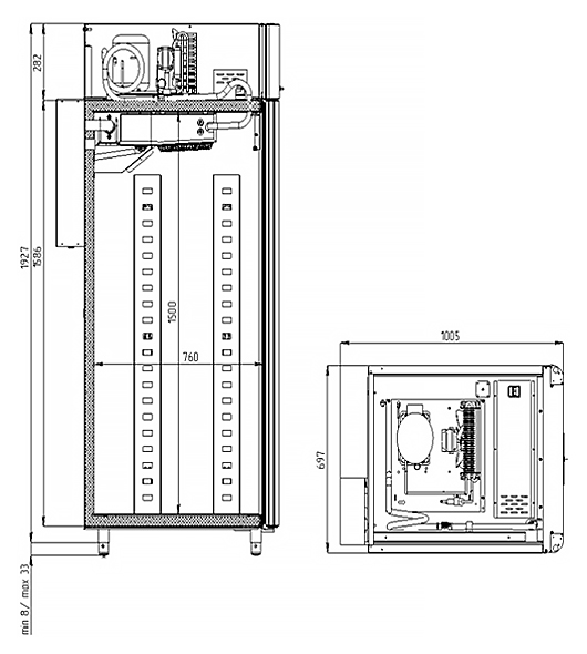 Каталог оборудования Холодильное оборудованиеШкафы холодильныеСпециализированные холодильные шкафыШкаф холодильный для хлебопекарных производств Polair CS107 Bakery Br черный, со стеклом (Тип 1) Шкаф холодильный для хлебопекарных производств Polair CS107 Bakery Br черный, со стеклом (Тип 1) Код товара: 062-624 Поделиться: WhatsAppTelegram СравнитьДобавить в КПВ избранное 0 405 450 ₽ В корзину 0 шт Под заказСамовывоз сегодня бесплатно Взять в кредит Купить в лизинг Получить консультацию в WhatsApp Описание Характеристики Отзывы 0 Инструкции 5 Шкаф холодильный для хлебопекарных производств Polair CS107 Bakery Br черный, со стеклом (Тип 1) предназначен для создания оптимальных условий хранения и расстойки заготовок из теста на предприятиях общественного питания и торговли. Корпус цельнозаливной: внешняя обшивка выполнена из стали с чёрным полимерным покрытием, внутренняя — из нержавеющей стали. Дверь — стеклопакет. Оборудование рассчитано на работу при температуре окружающей среды до 40 °C. Объём шкафа составляет 700 литров. В комплект входит 20 пар направляющих размером 400×600 мм. Особенности: Автоматическая оттайка с системой испарения конденсата Динамическое охлаждение с мягким обдувом без заветривания Верхнее расположение агрегата Многофункциональные режимы: охлаждение и замедление ферментации, хранение, регенерация, брожение, расстойка Панель управления с 5-дюймовым дисплеем: контроль температуры, влажности (регулируется от 60 до 95%), скорости вентилятора и времени Возможность создания и сохранения собственных программ Встроенный ультразвуковой увлажнитель (требуется подключение к системе водоочистки и централизованной канализации) Распашная дверь с механизмом самозакрывания и лёгкозаменяемым магнитным уплотнителем Съёмные направляющие для удобства уборки и регулировки Штампованное углубление в дне корпуса для облегчения ухода Педаль для удобного открытия двери Специальный пластиковый бордюр по внутреннему периметру камеры для защиты оборудования от повреждений при столкновениях с хлебопекарными тележками Экологичный хладагент R290 Энергоэффективность: потребляемая мощность — 0,55 кВт (охлаждение), 0,9 кВт (нагрев) Толщина стенки корпуса — 43 мм Polair CS107 Bakery Br черный, со стеклом (Тип 1) — надёжное и функциональное оборудование для профессиональных пекарен и предприятий общественного питания. Шкаф обеспечивает точный контроль температуры и влажности, широкий выбор режимов для различных этапов работы с тестом, а также удобство эксплуатации и ухода. Высококачественные материалы и продуманная конструкция гарантируют долговечность и безопасность оборудования, что делает его оптимальным решением для эффективного производства хлебобулочных изделий.Изображение товара, представленного на фото, может отличаться от его фактического вида. Показать все Габаритные размеры697×1005×1960 ммДиапазон рабочей температурыот -10 до +40 °CДлина697 ммШирина1005 ммВысота1960 ммОбъём700 лКол-во дверей1 Тип двериСтеклянная Уровень влажностиот 60 до 95 %Направляющие под EN 40*6020 Расстояние между направляющими60 ммХолодильный агрегатВстроенный Тип оттайкиАвтоматическая Тип охлажденияДинамический ПодсветкаЕсть ХладагентR290 Вес нетто180 кгВес брутто205 кгБрендPolairВсе специализированные холодильные шкафы Из нержавейкиВсе специализированные холодильные шкафы Стеклянная дверь Оставить отз