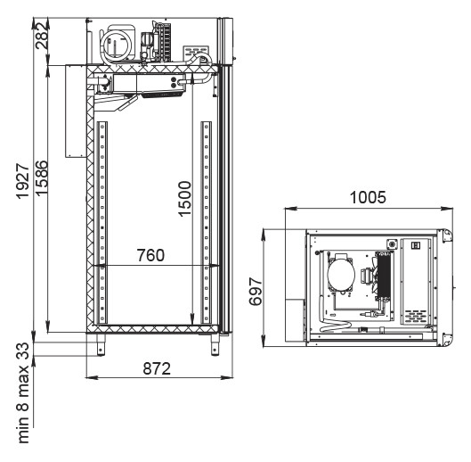 Каталог оборудования Холодильное оборудованиеШкафы холодильныеСпециализированные холодильные шкафыШкаф холодильный для вызревания сыра Polair CS107 Cheese черный, со стеклом Шкаф холодильный для вызревания сыра Polair CS107 Cheese черный, со стеклом Код товара: 062-626 Поделиться: WhatsAppTelegram СравнитьДобавить в КПВ избранное 0 389 300 ₽ В корзину 0 шт Под заказСамовывоз сегодня бесплатно Взять в кредит Купить в лизинг Получить консультацию в WhatsApp Описание Характеристики Отзывы 0 Инструкции 5 Шкаф холодильный для вызревания сыра Polair CS107 Cheese черный, со стеклом предназначен для создания оптимальных условий хранения и дозревания твердых и полутвердых сыров на предприятиях общественного питания и торговли. Монолитный цельнозаливной корпус снаружи изготовлен из стали с полимерным покрытием, внутри — из нержавеющей стали, дверь выполнена из стеклопакета. Оборудование рассчитано на работу при температуре окружающей среды до 40 °С. Особенности: Верхнее расположение агрегата для эффективного охлаждения Многофункциональная русифицированная панель управления с дисплеем диагональю 5" Возможность создания и сохранения собственных программ в памяти электронного блока Четыре перфорированные полки из нержавеющей стали для удобного размещения сыров Встроенный ультразвуковой увлажнитель (требуется подключение к системе очищенной воды и централизованной канализации) Распашная дверь с заливной теплоизоляцией и заменяемым уплотнителем с магнитной вставкой Встроенная ручка для удобства эксплуатации Отключаемая внутренняя LED-подсветка Штампованное углубление в дне корпуса для облегчения ухода Педаль для бесконтактного открывания двери Регулировка уровня влажности от 60% до 95% Максимальная нагрузка на полку — 40 кг Толщина стенок корпуса — 43 мм Polair CS107 Cheese черный, со стеклом — это высокотехнологичное оборудование, которое создает идеальные условия для дозревания и хранения твердых и полутвердых сыров. Надежная конструкция, продвинутые системы увлажнения и управления обеспечивают сохранение качества и вкуса сырной продукции, повышая эффективность работы предприятий общественного питания и торговли.Изображение товара, представленного на фото, может отличаться от его фактического вида. Показать все Габаритные размеры697×1005×1960 ммДиапазон рабочей температурыот -2 до +30 °CДлина697 ммШирина1005 ммВысота1960 ммОбъём700 лКол-во дверей1 Тип двериСтеклянная Количество полок4 штДопустимая нагрузка на полку40 кгУровень влажностиот 60 до 95 %Холодильный агрегатВстроенный Тип оттайкиАвтоматическая Тип охлажденияДинамическое ПодсветкаЕсть ХладагентR290 Вес нетто160 кгВес брутто190 кгБрендPolairВсе специализированные холодильные шкафы Из нержавейкиВсе специализированные холодильные шкафы Стеклянная дверь Оставить отзыв Еще никто не оставил отзыв на этот товар Схема POLAIR CS107 Cheese.jpgИнструкция на POLAIR CS107 Cheese.pdfБрошюра на POLAIR CS107 Cheese.pdfДекларация о соответствии.pdfСертификат соответствия.pdf Похожие товары Перейти в каталог Под заказ 390 915 ₽ Шкаф холодильный для вызревания салями Polair CS107 Salami Под заказ 389 300 ₽ Шкаф холодильный для вызревания мяса Polair CS107 Meat черный, со стеклом (Тип 1) Под заказ 169 915 ₽ Шкаф холодильный для хлебопекарных производств Polair CS107 Bakery Bs Под заказ 385 050 ₽ Шкаф холодильный для вызревания салями Polair CS107 Salami со стеклом В наличии 397 290 ₽ Шкаф холодильный для хлебо