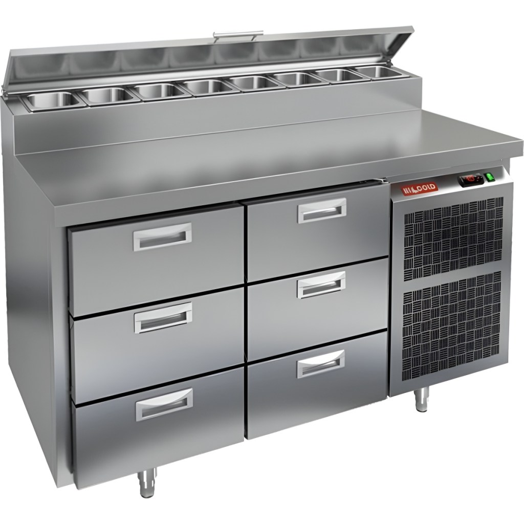 Стол холодильный для пиццы HiCold PZ2-33GN (1/6) предназначен для кухонь и предприятий общественного питания. Он используется для раскатки теста, подготовки ингредиентов для пиццы, салатов и других блюд, а также для охлаждения и кратковременного хранения скоропортящихся продуктов. Модель совмещает нержавеющую рабочую поверхность и охлаждаемый отсек с 6 выдвижными ящиками, обеспечивая удобный доступ к ингредиентам и эффективное хранение без дверей.