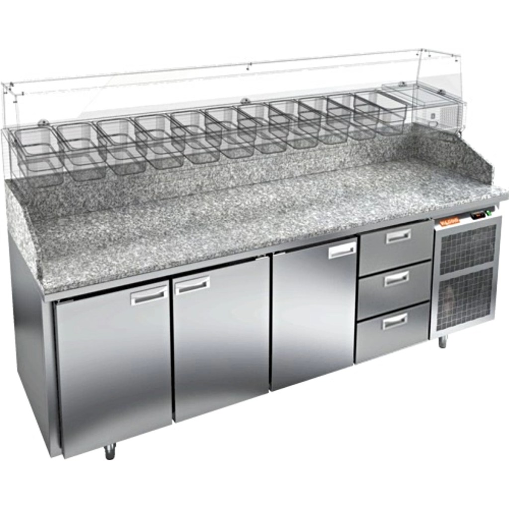 HiCold PZE3-1113/GN камень— это надёжный и функциональный холодильный стол для пиццы, который сочетает прочность, эргономику и эффективное охлаждение. Благодаря гранитной столешнице, корпусу из нержавеющей стали, двум глухим дверям и двум выдвижным ящикам он станет универсальным решением для профессиональной кухни.